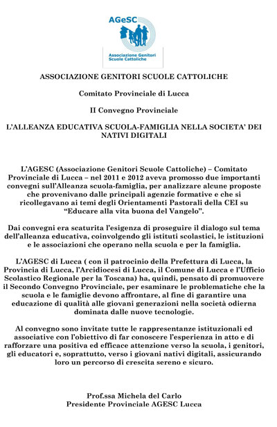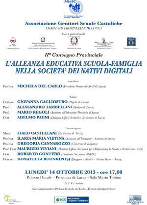 L’AGESC (Associazione Genitori Scuole Cattoliche) – Comitato Provinciale di Lucca – nel 2011 e 2012 aveva promosso due importanti convegni sull’Alleanza scuola-famiglia, per analizzare alcune proposte che provenivano dalle principali agenzie formative e che si ricollegavano ai temi degli Orientamenti Pastorali della CEI su “Educare alla vita buona del Vangelo”.